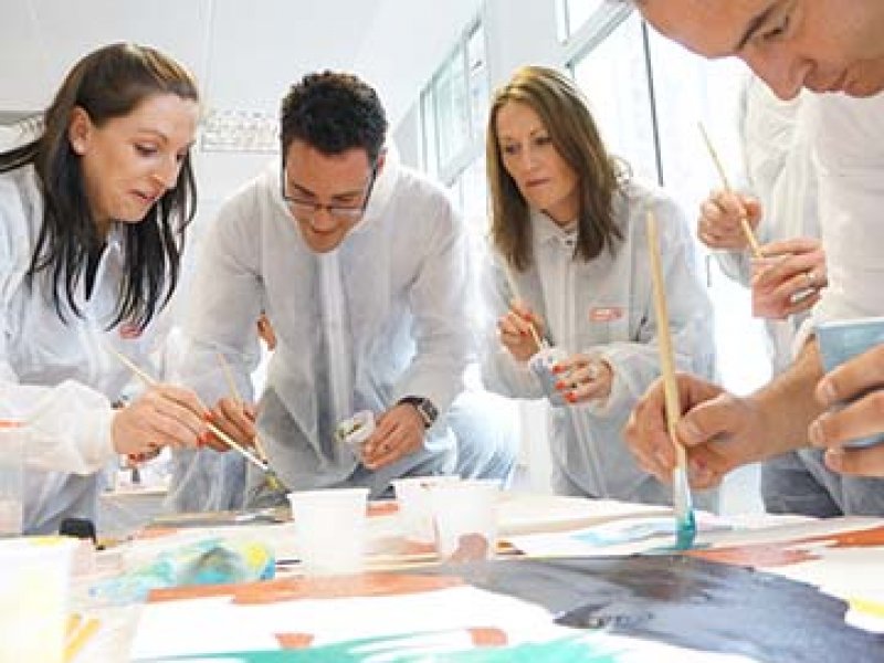 Deltagerne deles således i mindre teams, der hvert team får flere mindre Canvas Stykker de skal færdiggøre i korrekte farver og struktur men aldrig ved siden af hinanden. De vil hurtigt opdage at ’’Det store billede’’ kræver samarbejde på tværs af teamene samt en god struktur og effektiv kommunikation.